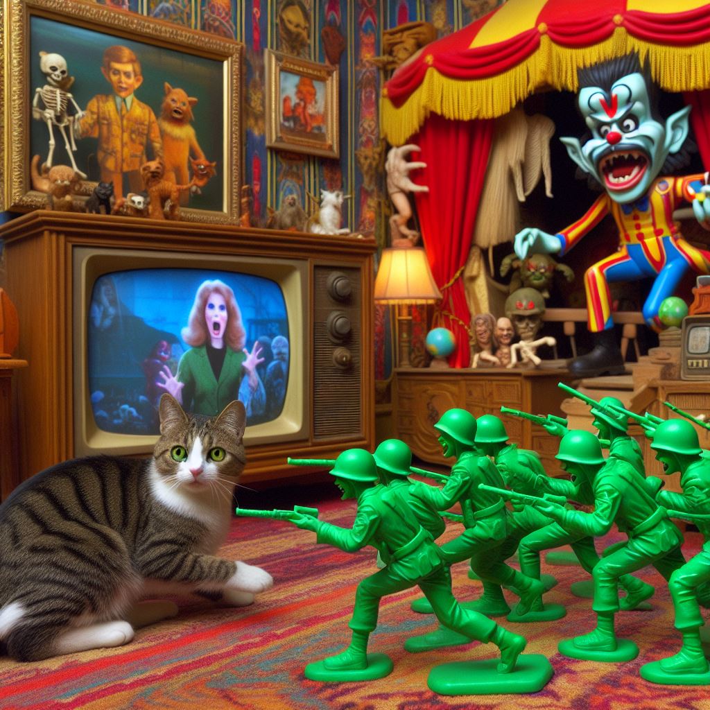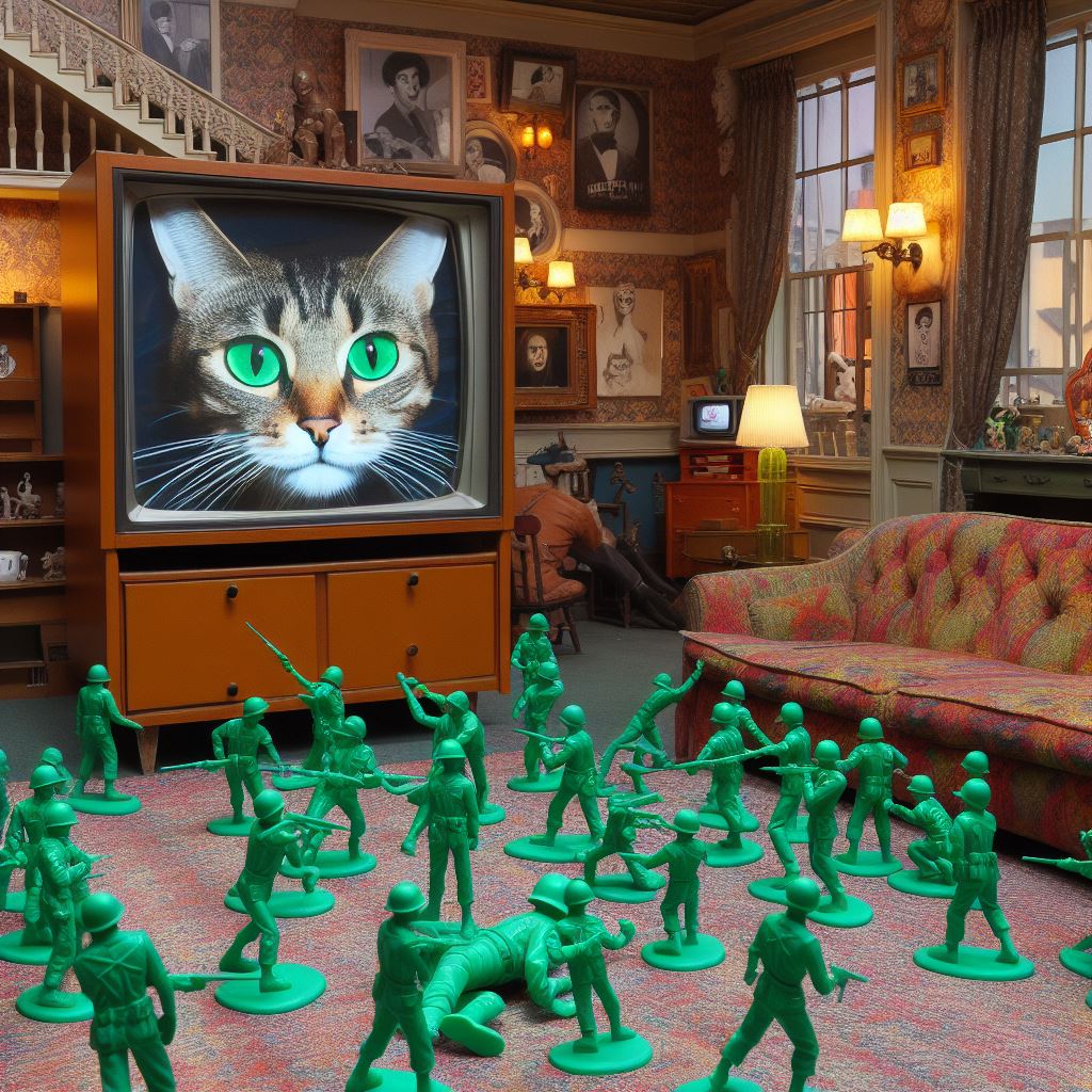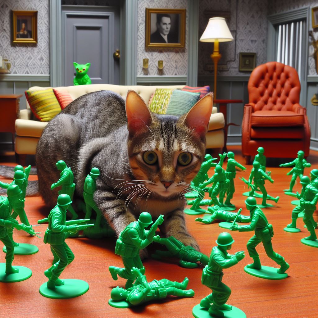 In the shaggy trenches of grandma’s living room, the battle rages on. Plastic green soldiers, forever locked in mid-salute or sniper pose, square off against their most fearsome adversary yet—a smug housecat with warlord eyes and claws to match.