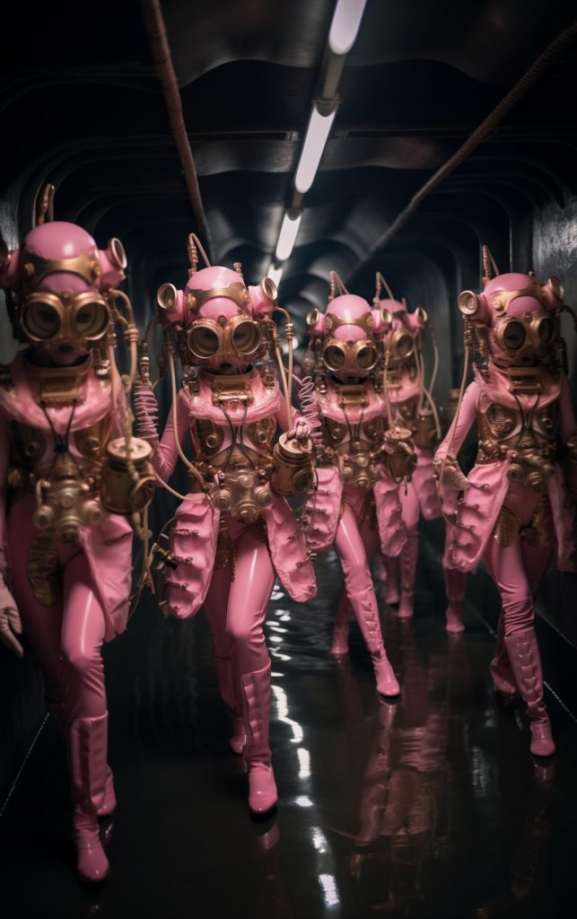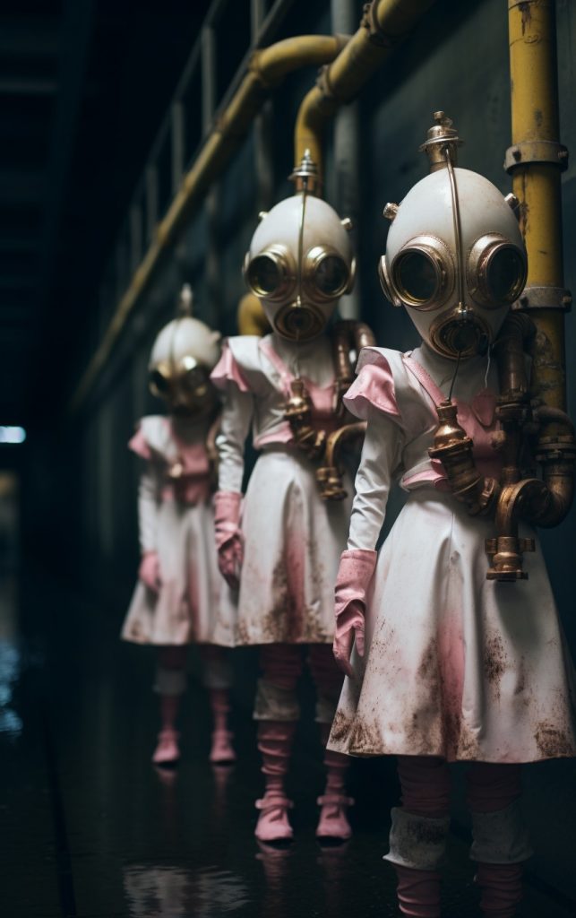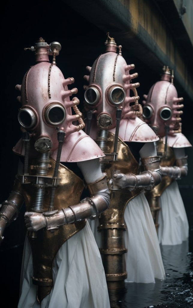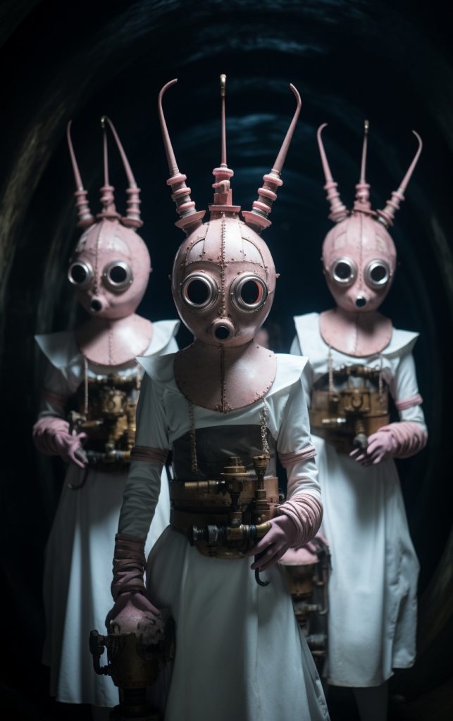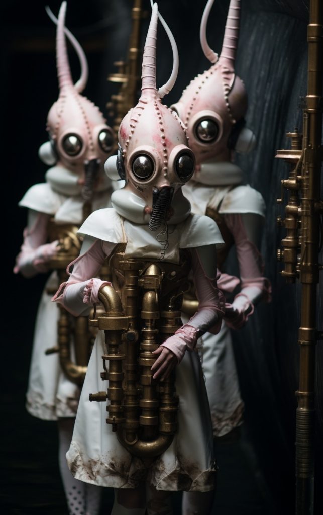 The Diving Belles ascend in silence, their mutation affords them no solace. Adorned in ritual white, their virginal uniforms are untouched by time, but cinched with antiquated machinery that hisses and ticks with the precision of a quartz crystal in vibration, relics of a past, and equipped to last a millennia.