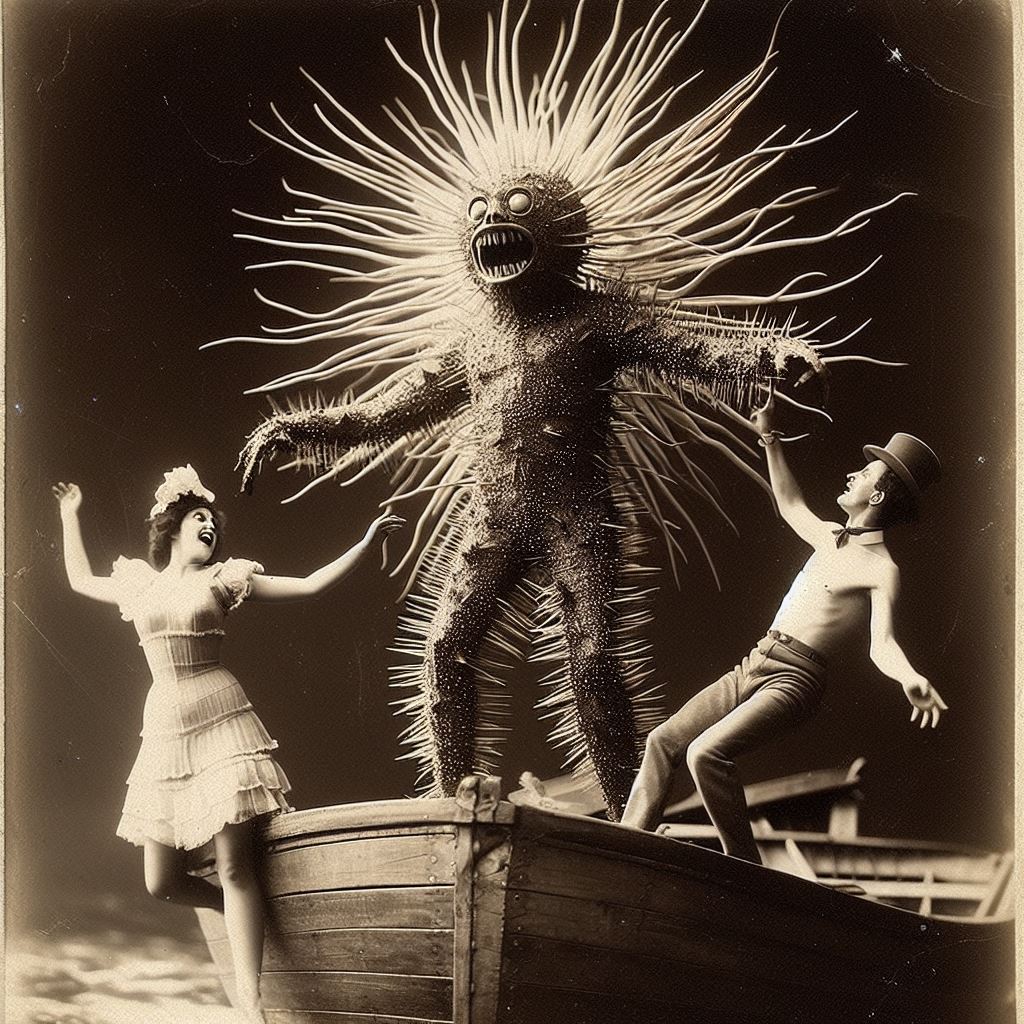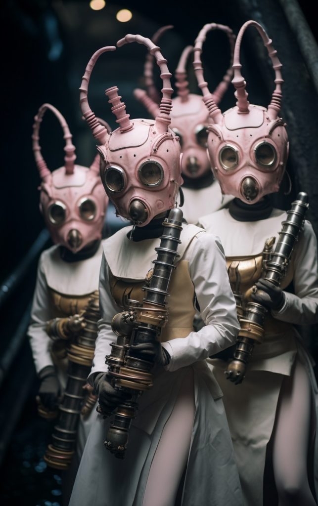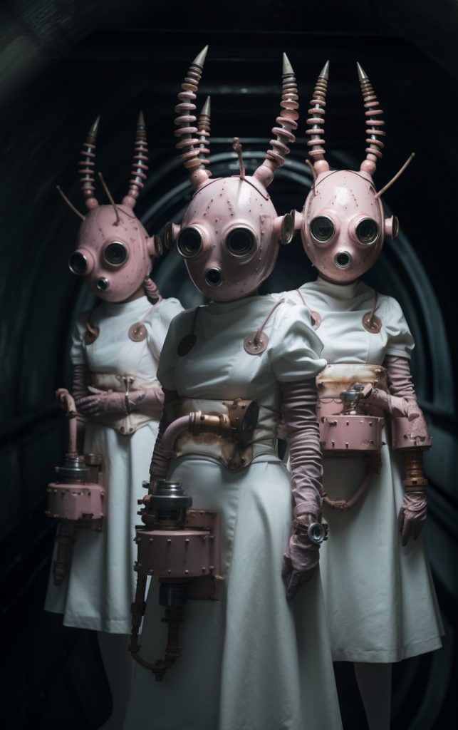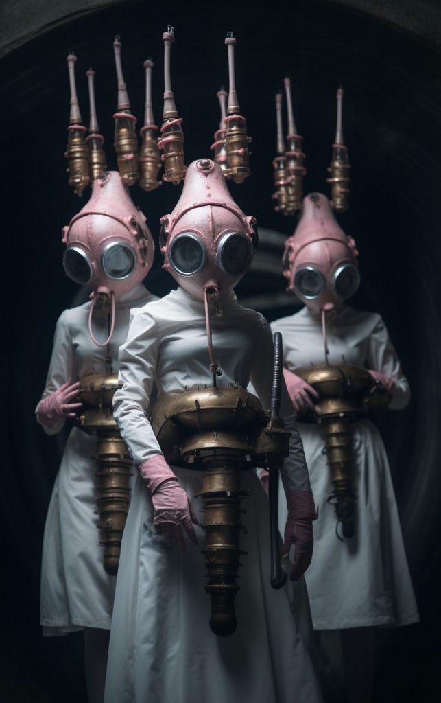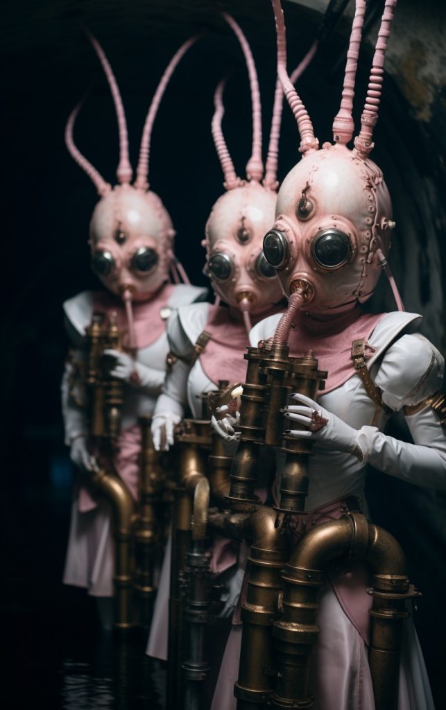 The Diving Belles ascend in silence, their mutation affords them no solace. Adorned in ritual white, their virginal uniforms are untouched by time, but cinched with antiquated machinery that hisses and ticks with the precision of a quartz crystal in vibration, relics of a past, and equipped to last a millennia.