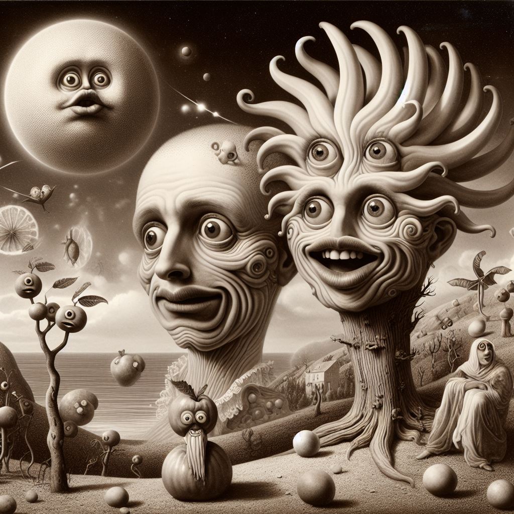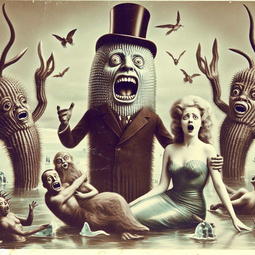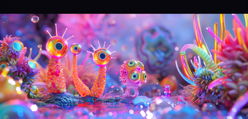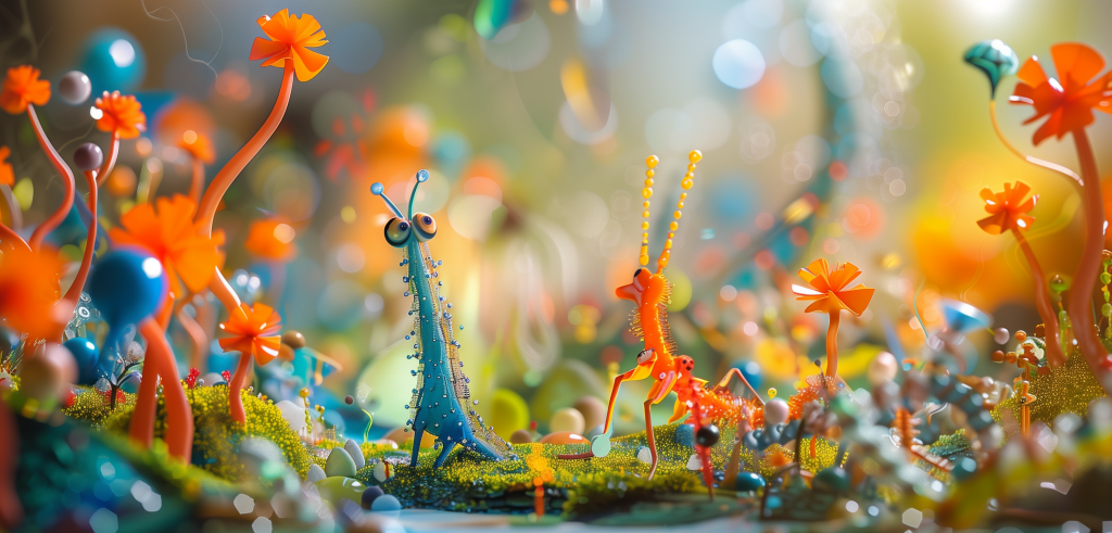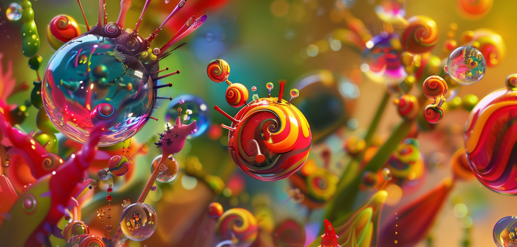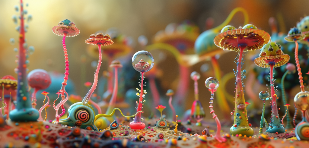 Creatures Underfoot dwell in the molten margins of reason — radiant, wriggling things that pulse with color theory and cosmic nonsense. They bloom from spores of sound, coil around vibrations, and whisper to your soles in a language made of shimmer. Beneath every reflective puddle, every rainbow-spit swamp, they gather in parliaments of paradox: some shaped like flowers that walk, others like thoughts that bite. Though microscopic in myth, they loom large in hallucination. Step lightly, dream brightly — the soil thinks back