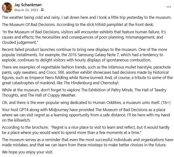 Midjourney 4 (11-2022) and v5 (3-2023) saw a pair of big advances, locking David Holz Midjourney project in solid with the emerging AI art community. The images I was generating inspired the writing of a sc-fi novel. There was a certain flavor of photorealism that made these fun and appealing.