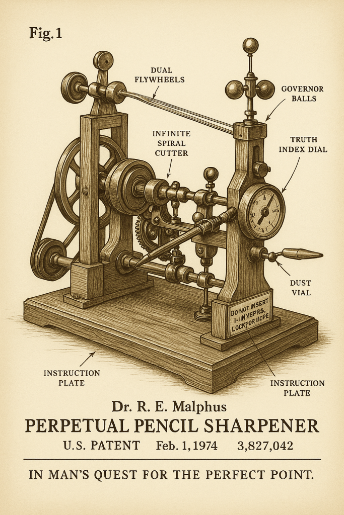 He is survived by his wife, Ethel (who patiently tolerated the endless grind of belt drives and whir of governor balls), two children who inherited his clumsiness if not his curiosity, and dozens of former students who claimed to have learned more in Dr. Malphus’ wood shop class than in the 10 years that preceded.