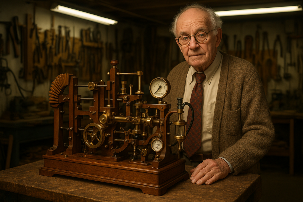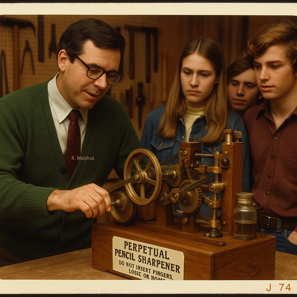 WESTON, VT — Dr. Reginald E. Malphus, 77, passed quietly in his workshop on a Tuesday afternoon, surrounded by the walnut and brass contraptions that defined his peculiar genius. Known across Windham County as “The Professor”, and despite having no formal education beyond a mail-order certificate in “Advanced Pedagogical Mechanics,” he spent 35 years teaching wood shop at Weston Union High School, where he became a fixture in flannel, spectacles, and a perpetual film of sawdust.