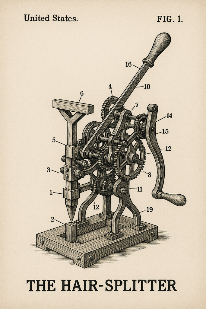 “Now listen closely, people. You may think this is just a jumble of brass and oak, but what we have here is the Capillary Bifurcation Apparatus — or what I like to call The Hair-Splitter.“