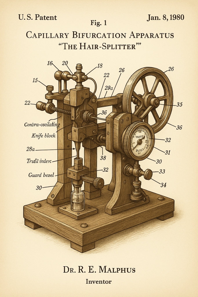 The apparatus secures a hair within a tapered collet and advances it by micrometer to a vibrating guillotine knife. A harmonic flywheel tuned by an eccentric governor produces a sympathetic oscillation, ensuring division into two (or, optionally, four) filaments of equal futility. Output is collected in a Result Vial for archival.